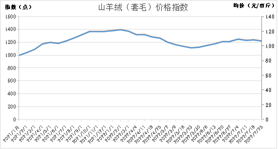 截至2022年7月25日,山羊绒(套毛)价格指数报1225.60点,周环比(2022年7月18日,下同)下跌1.34%,山羊绒(套毛)价格报106.75元/市斤,较上周同期下跌1.45元/市斤。