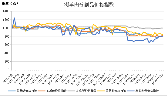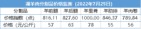 截至2022年7月25日,与上周同期相比,湖羊肉分割品价格表现不一。