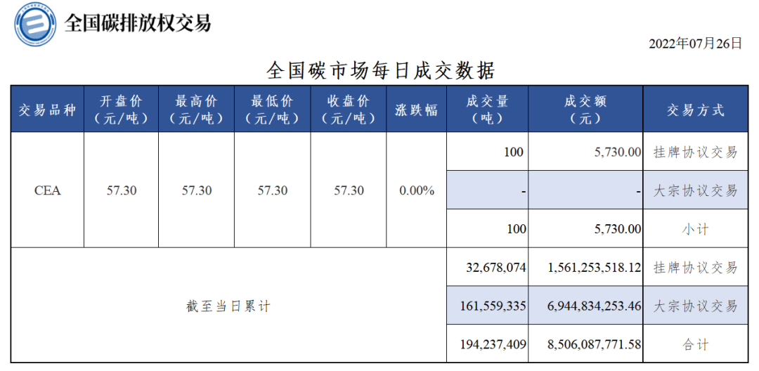 7月26日全国碳市场碳排放配额(CEA)挂牌协议交易成交量100吨,成交额5,730.00元,收盘价57.30元/吨,收盘价与前一日持平。今日无大宗协议交易。