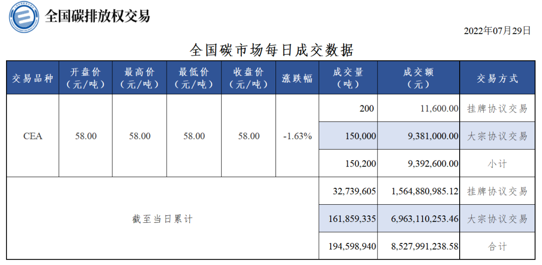 7月29日全国碳市场收盘价58.00元/吨 较前一日下跌1.63%