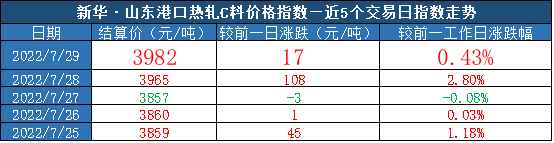新华财经·指数|山东港口大商中心钢坯、热轧C料价格指数日报(7月29日)