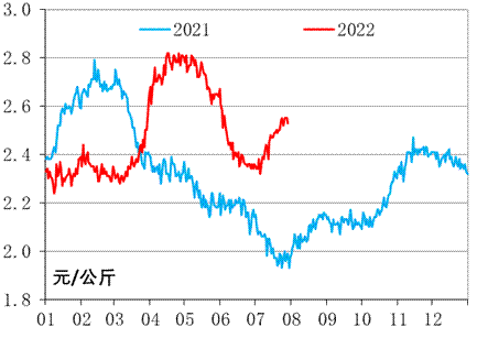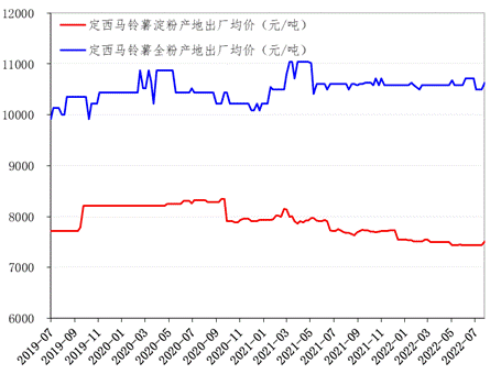国际通胀背景下,大多数欧美国家生产的初级薯制品价格上调。然而消费整体低迷的背景下,国内初级薯制品开工率不高。期间,定西市大力提升产业延链强链,尤其定西宽粉,提升了定西加工企业生产积极性,呈现出定西初级薯制品出厂价格率先上涨的态势。截至2022年7月29日,定西马铃薯淀粉出厂价格报7513.04元/吨,环比上涨0.93%,同比下跌2.26%;定西马铃薯全粉出厂价格报10631.07元/吨,环比上涨1.25%,同比上涨0.21%。