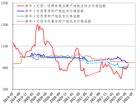备注:样本发生变化时进行指数修正,通常为年度间调整。对应地,产地均价不做修正以便反映确切产地价格水平。截至2022年5月27日,2021/2022年度定西商品薯销售结束,定西种薯完全进入销售淡季。因此,自2022年6月3日起仅更新新华·定西马铃薯淀粉产地批发价格指数,其余指数待新产季开始后恢复更新。