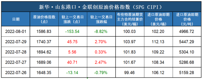 新华财经北京8月2日电(杨猛) 截至2022年8月1日,新华·山东港口·金联创原油价格指数(SPG CIPI)报1586.83点,较前一交易日下跌153.54点,跌幅8.82%;进口原油即期价格为102.20美元/桶,合人民币4966.72元/吨。山东港口进口原油综合到岸贴水估价为6.88美元/桶,较前一交易日下跌0.32美元/桶,跌幅4.44%。