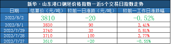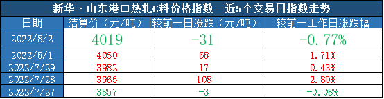 新华财经·指数|山东港口大商中心钢坯、热轧C料价格指数日报(8月2日)
