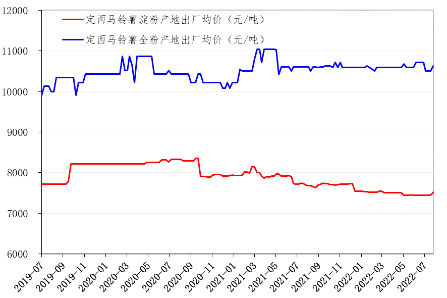 截至7月29日,定西马铃薯淀粉产地出厂均价报7513.04元/吨,环比六月末上涨0.93%,同比上一年七月末下跌2.26%;定西马铃薯全粉产地出厂均价报10631.07元/吨,环比六月末下跌0.81%,同比上一年七月末上涨0.21%。