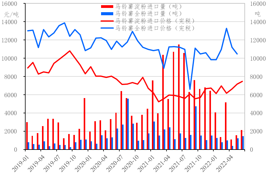 同期,我国初级薯制品进口价格与定西薯制品出厂价格趋同。进口方面,从德国或丹麦进口马铃薯淀粉的体量环比翻倍、价格环比上行,带动整体进口价格持续上行;马铃薯全粉则因从比利时进口量提升和进口价的大幅下跌,导致整体进口价格短暂下行。具体来看,六月份,我国进口马铃薯淀粉2131吨,较5月上涨35.96%;进口均价为7468元/吨(完税价),较5月上涨4.44%。同期,我国进口马铃薯全粉均价为10459元/吨(完税价),较5月下跌6.59%。