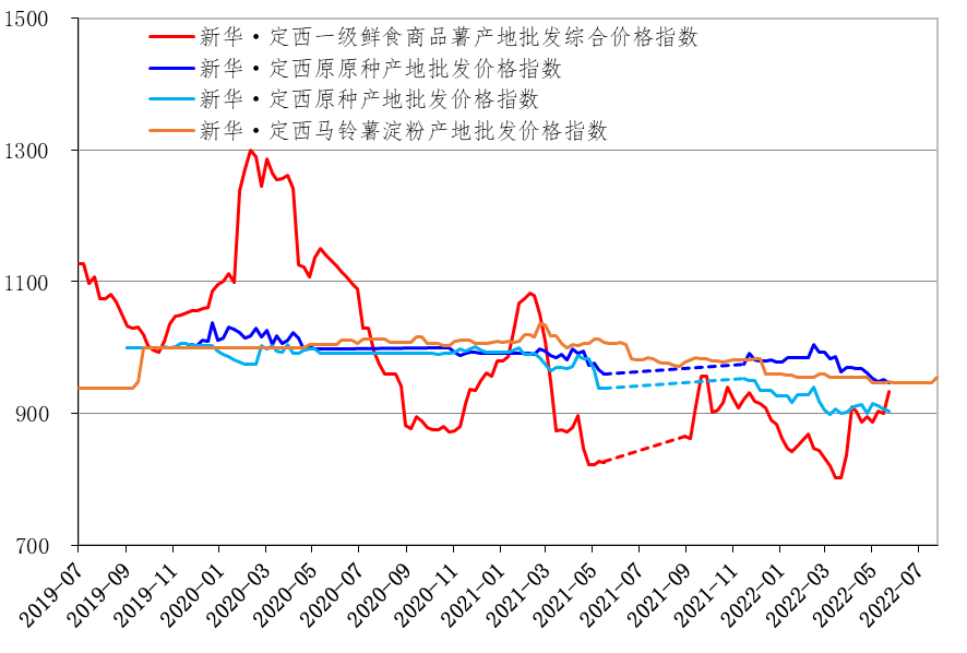 备注:截至2022年5月27日,2021/2022年度定西商品薯销售结束,定西种薯完全进入销售淡季。因此,自2022年6月3日起仅更新新华·定西马铃薯淀粉产地批发价格指数,其余指数待新产季开始后恢复更新。