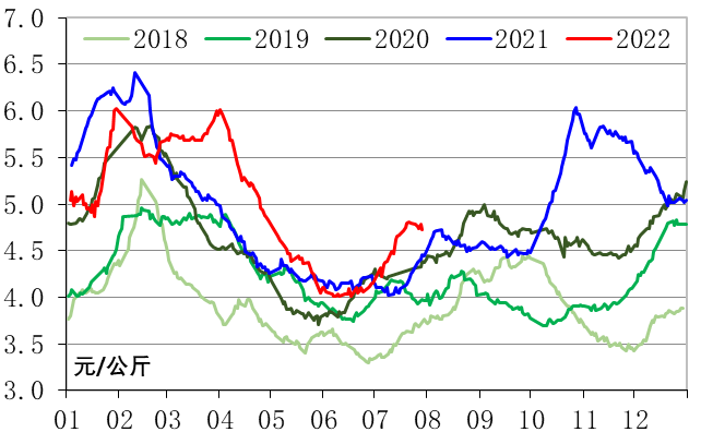 进入七月份,供给主力逐步切换至北方大田蔬菜。期间,雨水天气频发,带动全国蔬菜批发价格持续上行。截至7月29日,全国蔬菜批发价格报4.73元/公斤,环比六月底(6月30日,下同)累计上涨13.98%,同比上一年七月末上涨6.53%;同时周度环比小幅下跌1.25%,价格上行已现疲态。