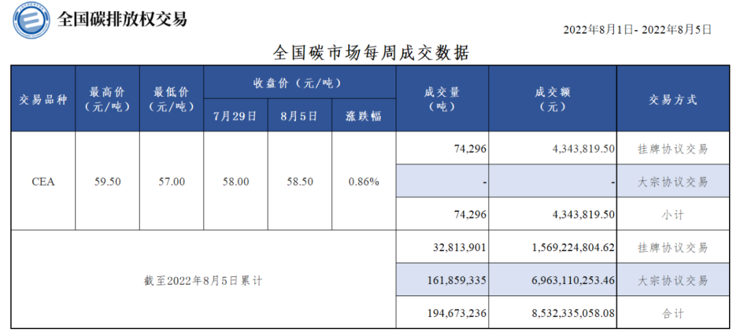 本周(8月1日-5日)全国碳市场碳排放配额(CEA)总成交量74,296吨,总成交额4,343,819.50元。挂牌协议交易周成交量74,296吨,周成交额4,343,819.50元。