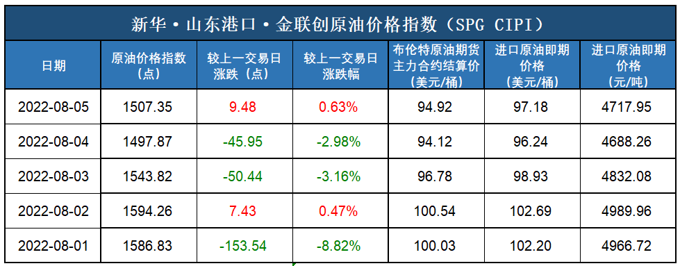 新华财经北京8月8日电(杨猛) 截至2022年8月5日,新华·山东港口·金联创原油价格指数(SPG CIPI)报1507.35点,较前一交易日上涨9.48点,涨幅0.63%;进口原油即期价格为97.18美元/桶,合人民币4717.95元/吨。山东港口进口原油综合到岸贴水估价为4.59美元/桶,较前一交易日下跌2.13美元/桶,跌幅31.70%。