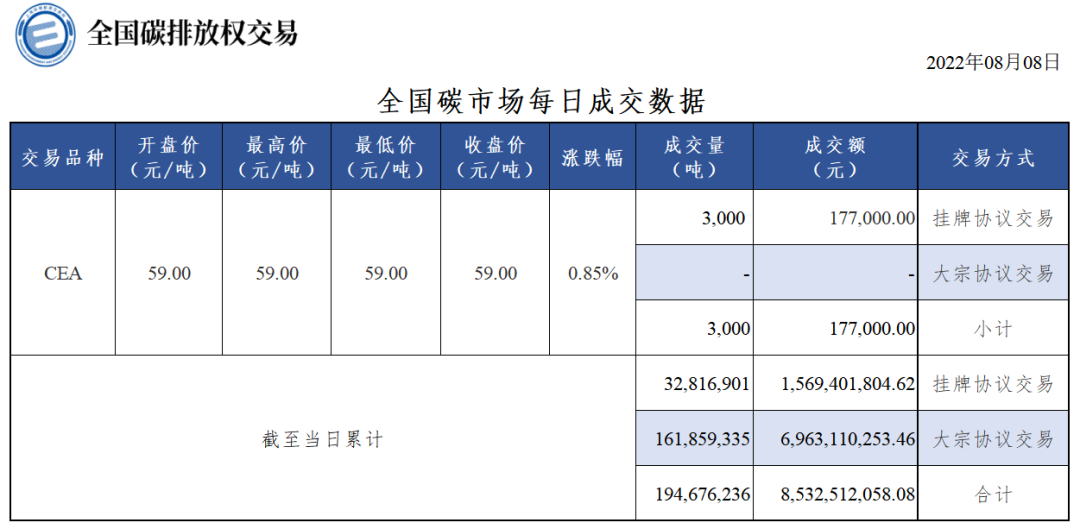 8月8日全国碳市场收盘价59.00元/吨 较前一日上涨0.85%
