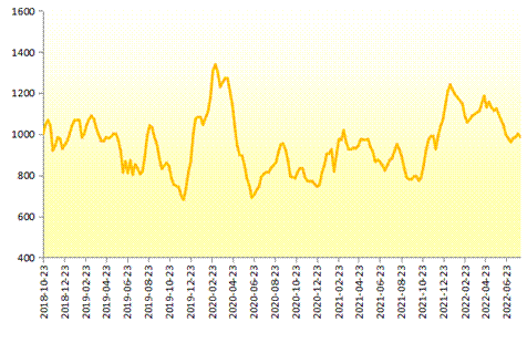 2022年8月3日,新华-进口香蕉价格指数报985.77点,较7月27日下跌15.58点,跌幅1.56%;较基期下跌14.23点,跌幅1.42%。