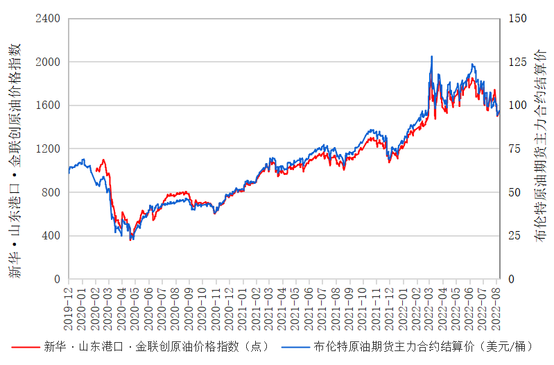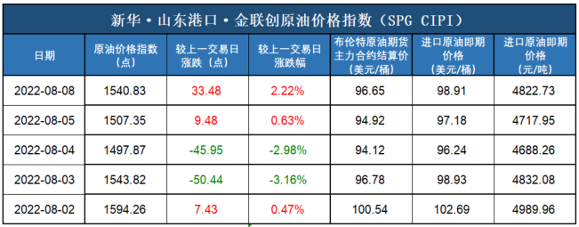 新华财经北京8月10日电(杨猛) 截至2022年8月8日,新华·山东港口·金联创原油价格指数(SPG CIPI)报1540.83点,较前一交易日上涨33.48点,涨幅2.22%;进口原油即期价格为98.91美元/桶,合人民币4822.73元/吨。山东港口进口原油综合到岸贴水估价为4.59美元/桶,较前一交易日持平。