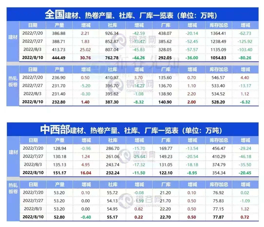 截至8月10日当周,全国建材社库762.78万吨,较上周下降5.48%;厂库292.05万吨,较上周下降10.97%;产量444.49万吨,较上周上升7.43%。