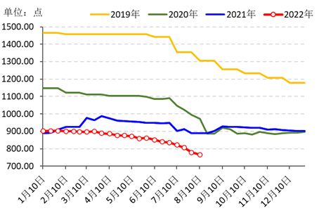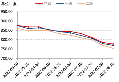 从质量等级维度来看,八月上旬全国各等级花椒指数回调放缓,二级花椒价格差距与其他等级花椒价格拉大。截至8月10日,特级花椒价格指数报776.38点,较上期下跌1.14%,较基期下跌22.36%;一级花椒价格指数报769.63点,较上期下跌1.26%,较基期下跌23.04%;二级花椒价格指数报754.22点,较上期下跌2.13%,较基期下跌24.58%。