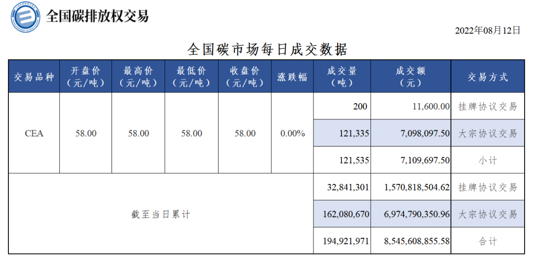 8月12日全国碳市场碳排放配额(CEA)挂牌协议交易成交量200吨,成交额11,600.00元,收盘价58.00元/吨,收盘价与前一日持平。今日大宗协议交易成交量121,335吨,成交额7,098,097.50元。