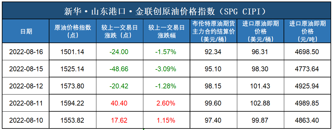 新华财经北京8月17日电(杨猛) 截至2022年8月16日,新华·山东港口·金联创原油价格指数(SPG CIPI)报1501.14点,较前一交易日下跌24.00点,跌幅1.57%;进口原油即期价格为96.31美元/桶,合人民币4698.50元/吨。山东港口进口原油综合到岸贴水估价为3.45美元/桶,较前一交易日下跌0.85美元/桶,跌幅19.77%。
