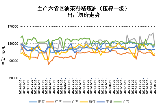 根据“新华·中国油茶产品价格指数(常山发布)”数据显示,截至8月20日,全国各重点省区油茶生产加工企业油茶籽精炼油(压榨一级)出厂均价较7月下半月微幅上行。