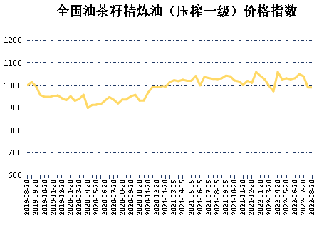截至8月20日,全国油茶籽精炼油(压榨一级)价格指数报992.25点,较7月下半月990.00点上涨2.25点,涨幅0.23%,指数微幅上涨;指数较基期下跌7.75点,跌幅0.78%。