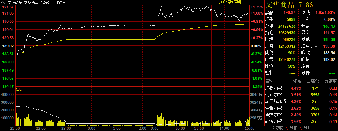 新华财经北京8月22日电(张瑶、郭洲洋)国内商品期货市场周一(8月22日)多数上涨。截至下午收盘,追踪国内商品市场的综合指数收报190.97点,较上一交易日上涨1.95点,涨幅1.03%。上涨品种中,沪镍、苯乙烯(EB)、硅铁、纸浆、纯碱主力合约涨超4%;焦煤、棕榈油、棉纱主力合约涨超3%。下跌品种方面,沥青主力合约跌超3%;燃油、焦炭主力合约跌超2%。