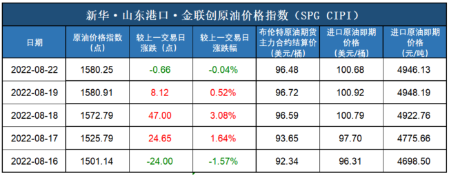 新华财经北京8月23日电(杨猛) 截至2022年8月22日,新华·山东港口·金联创原油价格指数(SPG CIPI)报1580.25点,较前一交易日下跌0.66点,跌幅0.04%;进口原油即期价格为100.68美元/桶,合人民币4946.13元/吨。山东港口进口原油综合到岸贴水估价为3.61美元/桶,较前一交易日持平。