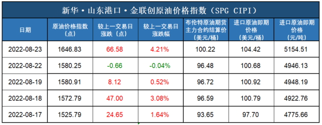 新华财经北京8月24日电(杨猛) 截至2022年8月23日,新华·山东港口·金联创原油价格指数(SPG CIPI)报1646.83点,较前一交易日上涨66.58点,涨幅4.21%;进口原油即期价格为104.42美元/桶,合人民币5154.51元/吨。山东港口进口原油综合到岸贴水估价为3.10美元/桶,较前一交易日下跌0.51美元/桶,跌幅14.13%。