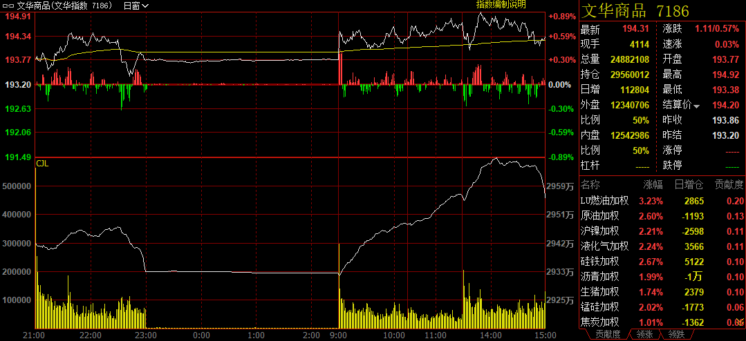 截至25日下午收盘时,追踪国内商品市场的综合指数收报194.31点,较上一交易日上涨1.11点,涨幅0.57%。全天商品市场累计净流出资金3.07亿元。