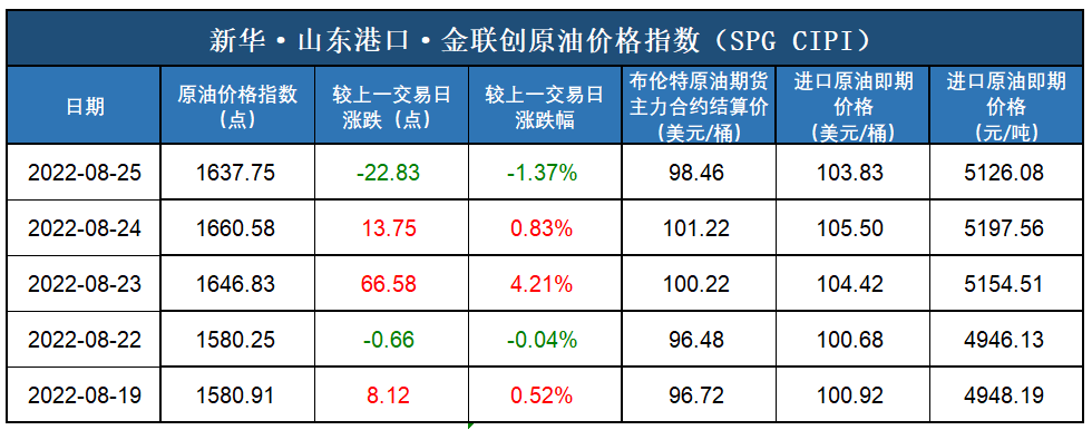 新华财经北京8月26日电(杨猛) 截至2022年8月25日,新华·山东港口·金联创原油价格指数(SPG CIPI)报1637.75点,较前一交易日下跌22.83点,跌幅1.37%;进口原油即期价格为103.83美元/桶,合人民币5126.08元/吨。山东港口进口原油综合到岸贴水估价为2.77美元/桶,较前一交易日下跌0.18美元/桶,跌幅6.10%。