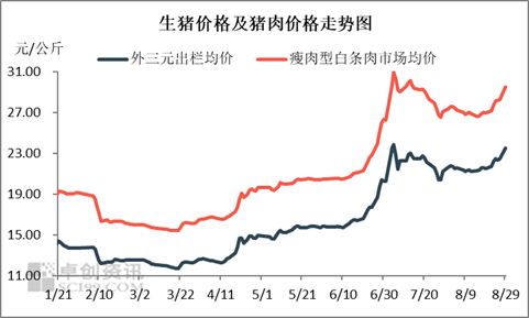 8月生猪及猪肉市场走势依然趋近,无明显价差拉大或缩小的动作。根据卓创资讯监测,截至29日,8月外三元生猪交易月均价21.73元/公斤。其中低点为9日的21.22元/公斤,较月初高点累计下滑2.57%;此后生猪价格震荡上涨,高点为29日的23.50元/公斤,较低点累计上涨10.74%。