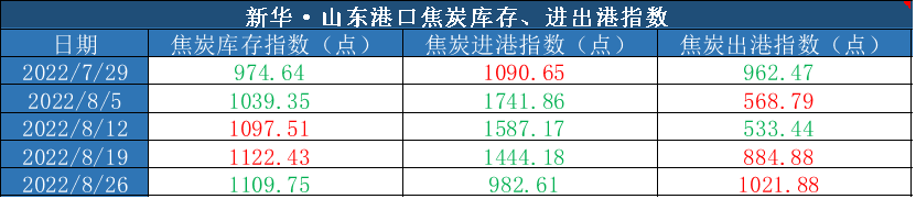 截至2022年8月26日,新华·山东港口焦炭进港指数报982.61点,较8月19日下跌461.57点,跌幅31.96%;新华·山东港口焦炭出港指数报1021.88点,较8月19日上涨137.00点,涨幅15.48%。