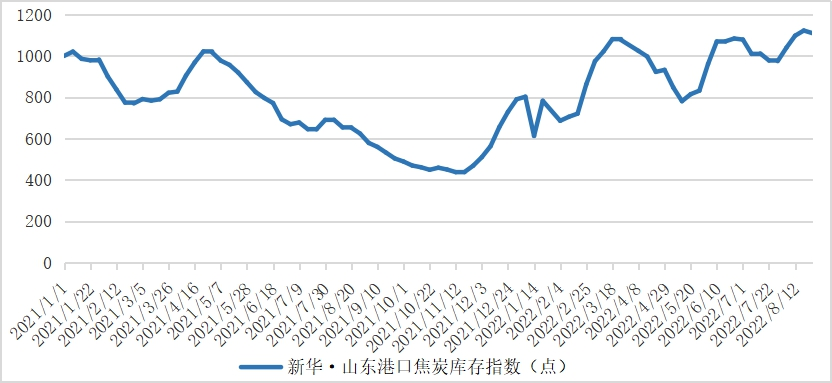 截至2022年8月26日,新华·山东港口焦炭库存指数报1109.75点,较8月19日下跌12.68点,跌幅1.13%。