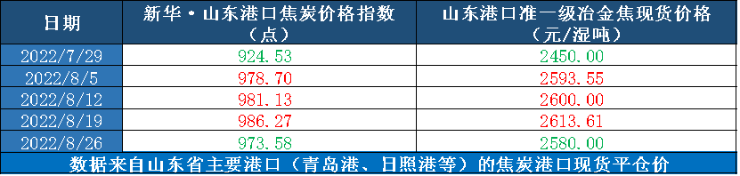新华财经·指数|新华·山东港口焦炭系列指数周报(2022.8.20-2022.8.26)