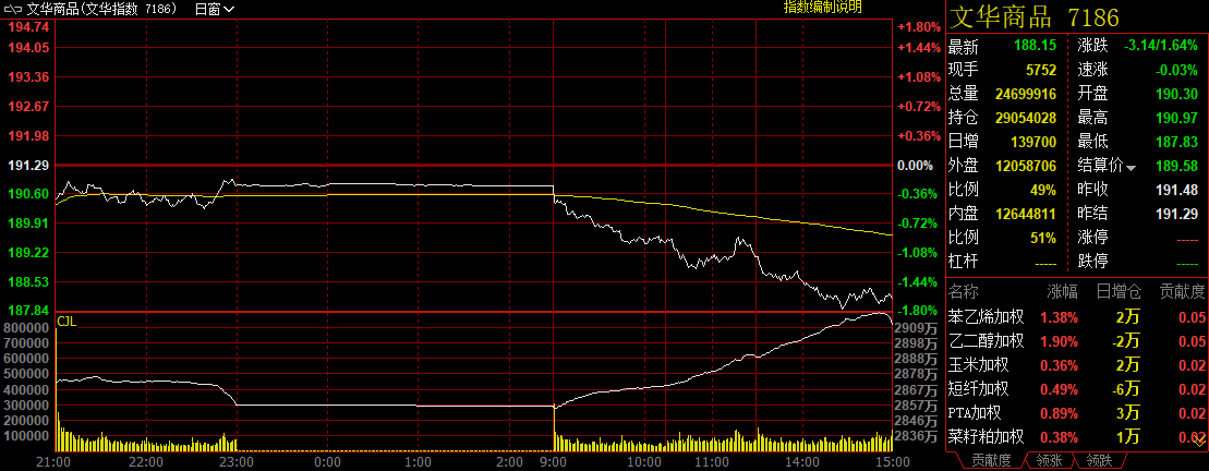 新华财经北京9月1日电(张瑶、吴郑思)国内商品市场1日大面积下跌。截至下午收盘,追踪国内商品市场的综合指数收报188.15点,较上一交易日下跌3.14点,跌幅1.64%。下跌品种中,低硫燃料油(LU)、沪锡主力合约跌超7%;燃料油主力合约跌超5%;棕榈油、豆油、液化气主力合约跌超3%。上涨品种中,乙二醇(EG)、苯乙烯(EB)、PTA主力合约涨超1%。