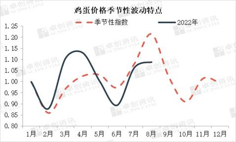 从季节性波动特点看,8月份蛋价处于上行阶段,今年8月份鸡蛋价格的走势符合季节性规律。同时,从季节性波动规律来看,9月份鸡蛋季节性指数大于1,说明鸡蛋价格整体呈现上涨态势,主因中秋节所在时间有所差异,中秋节对蛋价拉动作用较大。但今年中秋节时间为9月10日,时间较为提前,业者多不看好9月份鸡蛋市场行情。