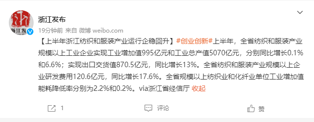 上半年,浙江全省纺织和服装产业规模以上工业企业实现工业增加值995亿元和工业总产值5070亿元,分别同比增长0.1%和6.6%;实现出口交货值870.5亿元,同比增长13%。
