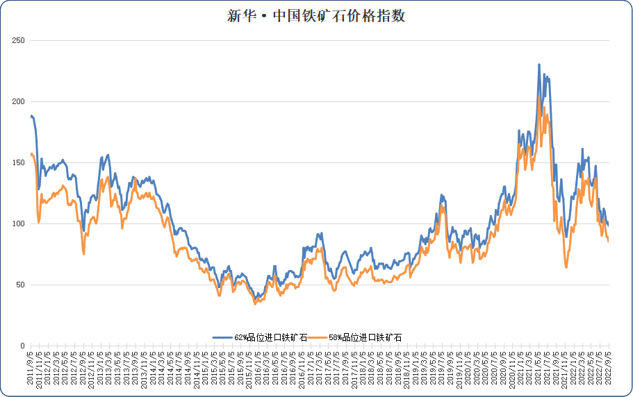 新华·中国铁矿石价格指数显示,8月30日至9月5日间,进口铁矿石价格偏弱运行。