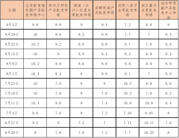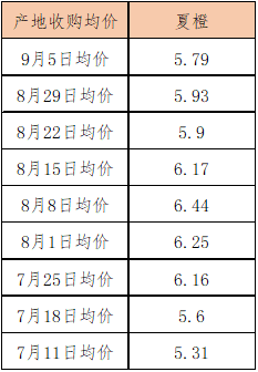 在脐橙产地收购方面,截至9月5日,秭归夏橙产地收购均价报5.79元/公斤,环比下跌2.40%;同比上涨82.77%。