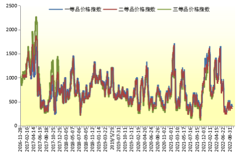 2022年9月2日,海南省皇帝蕉一等品价格指数报401.56点,较8月26日下跌40.16点,跌幅9.09%;较基期下跌598.44点,跌幅59.84%。二等品价格指数报361.41点,较8月26日下跌40.16点,跌幅10.00%;较基期下跌638.59点,跌幅63.86%;三等品价格指数报321.25点,较8月26日下跌40.16点,跌幅11.11%;较基期下跌678.75点,跌幅67.87%。