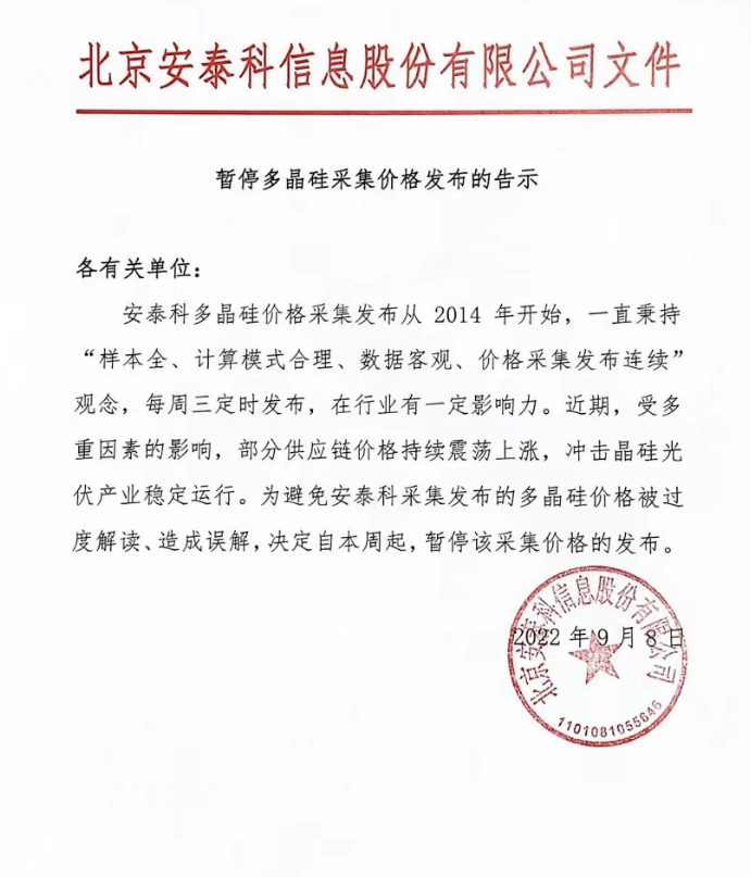 中国有色金属工业协会硅业分会发布告示称,安泰科多晶硅价格采集发布从2014年开始,每周三定时发布,在行业有一定影响力。近期,受多重因素的影响,部分供应链价格持续震荡上涨,冲击晶硅光伏产业稳定运行。为避免安泰科采集发布的多晶硅价格被过度解读、造成误解,决定自本周起,暂停该采集价格的发布。