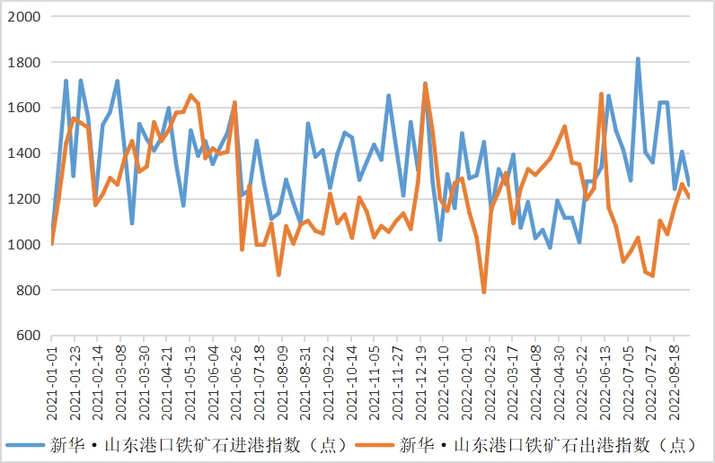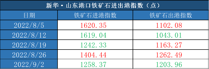截至2022年9月2日,新华·山东港口铁矿石进港指数报1258.37点,较8月26日下跌146.07点,跌幅10.40%;新华·山东港口铁矿石出港指数报1203.96点,较8月26日下跌58.52点,跌幅4.64%。