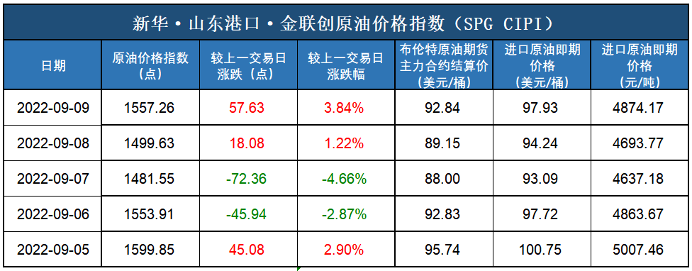 新华财经北京9月13日电(杨猛) 截至2022年9月9日,新华·山东港口·金联创原油价格指数(SPG CIPI)报1557.26点,较前一交易日上涨57.63点,涨幅3.84%;进口原油即期价格为97.93美元/桶,合人民币4874.17元/吨。山东港口进口原油综合到岸贴水估价为3.06美元/桶,较前一交易日持平。
