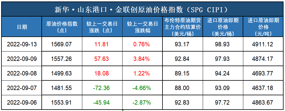 新华财经北京9月14日电(杨猛) 截至2022年9月13日,新华·山东港口·金联创原油价格指数(SPG CIPI)报1569.07点,较前一交易日上涨11.81点,涨幅0.76%;进口原油即期价格为98.93美元/桶,合人民币4911.12元/吨。山东港口进口原油综合到岸贴水估价为3.06美元/桶,较前一交易日持平。