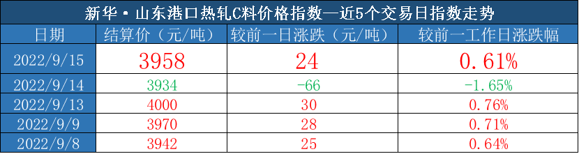 截至2022年9月15日,新华·山东港口热轧C料价格指数报3958元/吨,较前一交易日上涨24元/吨,涨幅0.61%。