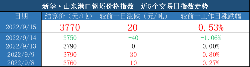 新华财经北京9月15日电(吕世阔) 截至2022年9月15日,新华·山东港口钢坯价格指数报3770元/吨,较前一交易日上涨20元/吨,涨幅0.53%。