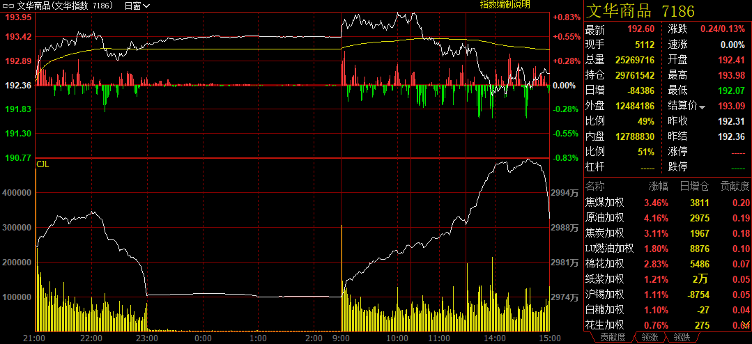 截至15日下午收盘,追踪国内商品市场的综合指数收报192.60点,较上一交易日上涨0.24点,涨幅0.13%。全天市场累计净流入资金10.43亿元。