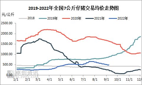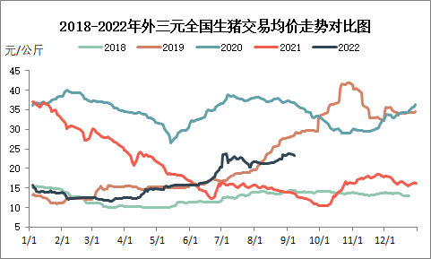 仔猪补栏情况是体现养殖端6个月后生猪出栏价格预期的重要指标。图2显示,2022年仔猪和生猪上半年走势基本一致,处于近几年历史低位水平;而仔猪下半年走势和生猪走出现分歧。下半年以来生猪价格一路震荡走高,但自2022年7月23日开始仔猪价格持续下滑,截至9月14日,环比下滑17.06%;生猪与仔猪价格走势相反。