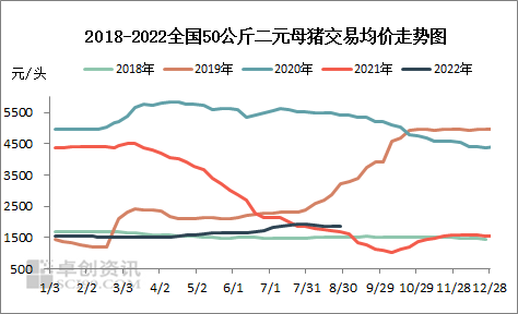 除了仔猪是影响业者对未来猪价的预期因素外,二元后备母猪价格也是反映预期较明显的指标之一。从下图可以看出7-9月份国内二元后备母猪价格持续高位,且显著高于同样位于猪周期底部的2018年,同比涨幅22.87%。二元后备母猪到商品猪出栏周期为13-14个月,2022年8-9月补栏二元后备母猪对应2023年10月份前后生猪出栏,四季度进入腌腊、灌肠传统消费旺季,需求端利多猪价,因此业者对2023年四季度持乐观预期,现阶段补栏二元后备母猪较积极,支撑二元后备母猪价格持续高位。