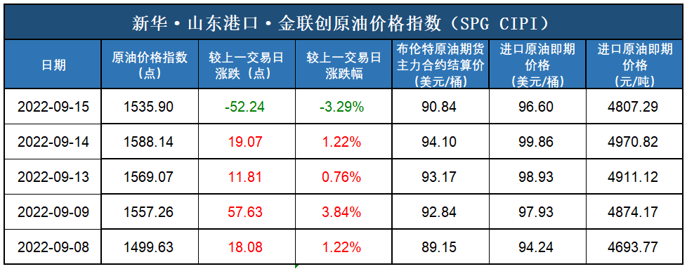 新华财经北京9月16日电(杨猛) 截至2022年9月15日,新华·山东港口·金联创原油价格指数(SPG CIPI)报1535.90点,较前一交易日下跌52.24点,跌幅3.29%;进口原油即期价格为96.60美元/桶,合人民币4807.29元/吨。山东港口进口原油综合到岸贴水估价为3.14美元/桶,较前一交易日上涨0.16美元/桶,涨幅5.37%。