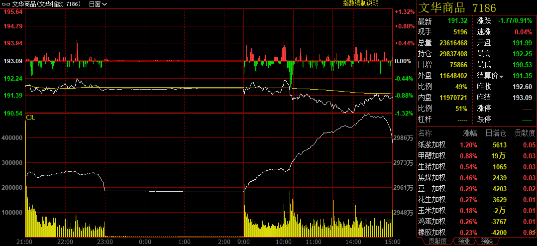 截至16日下午收盘时,追踪国内商品市场的综合指数收报191.32点,较上一交易日下跌1.77点,跌幅0.91%。全天商品市场累计净流出资金32.42亿元。